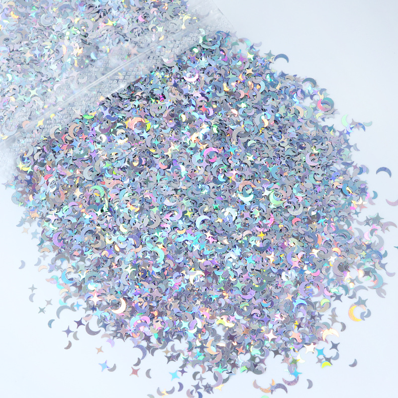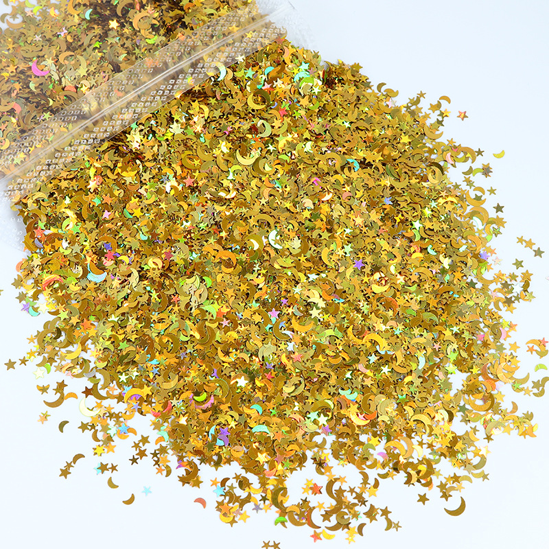 Product name:PET glitter Place of Origin:Guangdong,China Brand Name:XUCAI Model Number:Mix Size:1/8-1/128 Shape :Moon&Star Material:PET Color:Golden,Silvery. MOQ:1kg Packing :Opp Bag+Carton Application:Christmas decorations, cosmetics, printing Certificate:MSDS/SGS Sample:Avalialbe Sample time:1-2 day